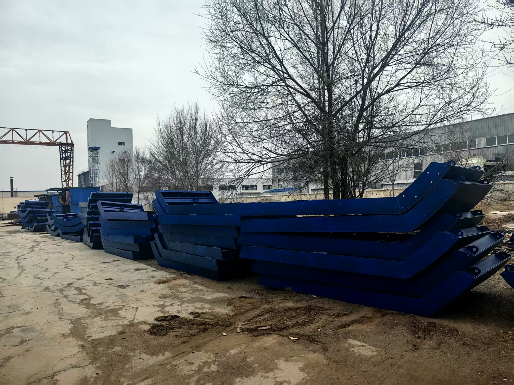 结构组成:面板(常用8–12mm Q345/Q235钢板)、背楞/肋板(槽钢、工字钢)、门架支撑、液压/丝杠调节系统、轨行行走机构;接缝处设密封条防漏浆。